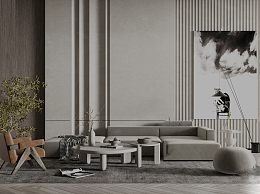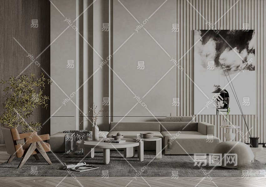 现代风格家居客厅 沙发茶几组合 休闲椅 落地灯 边几 装饰画 盆栽