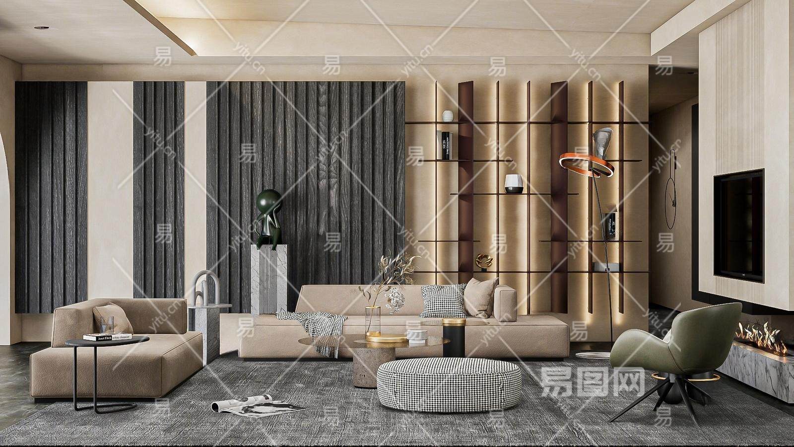 现代客厅 沙发茶几 休闲椅 绿植 盆栽 墙饰 吊灯 雕塑 饰品 摆件