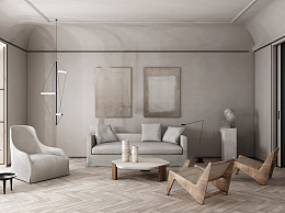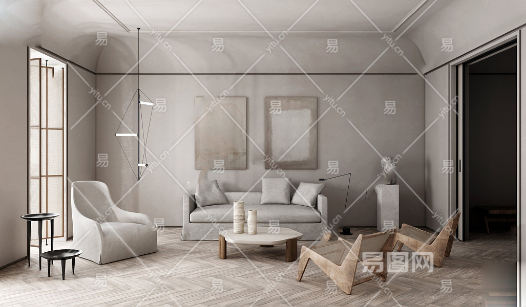 现代客厅 沙发茶几组合 单人沙发 装饰画 吊灯 雕塑摆件