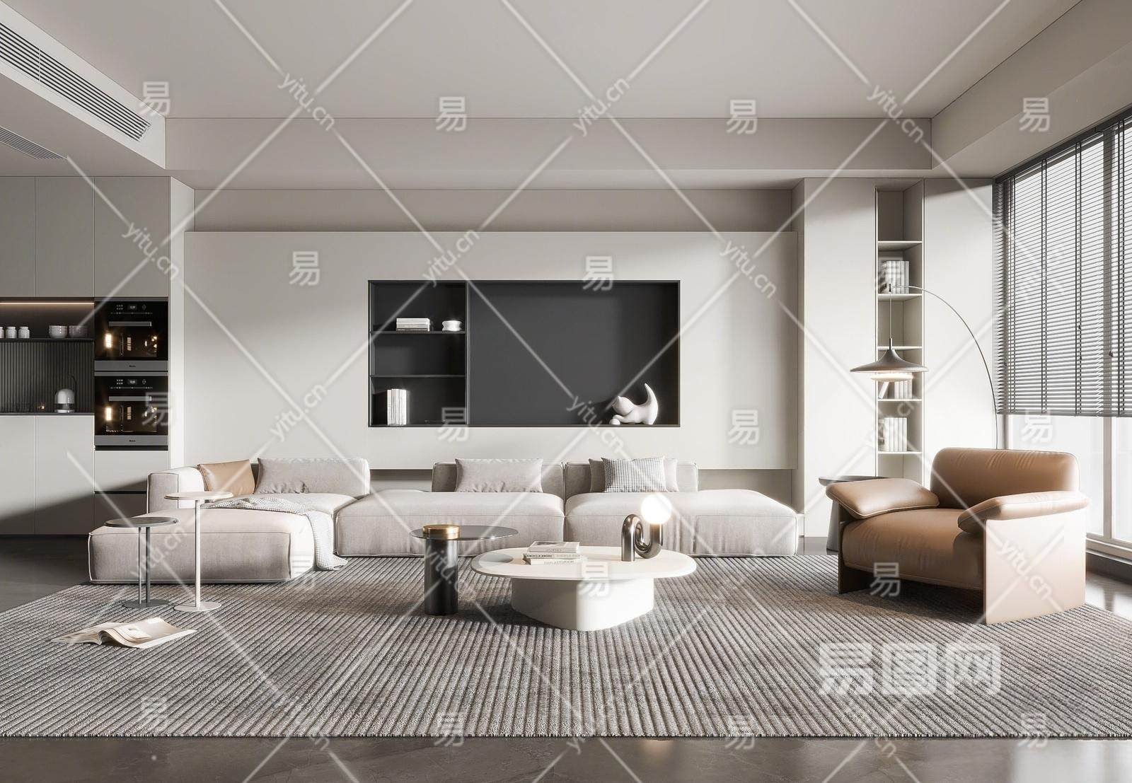 现代客厅 茶几 单人沙发 落地灯 电视墙
