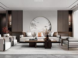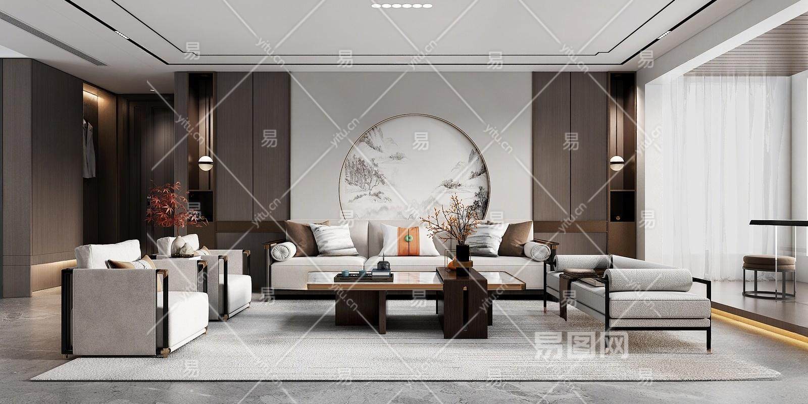 新中式客厅 休闲沙发 休闲单椅 茶几 沙发凳 酒柜 餐桌 餐椅 吊灯