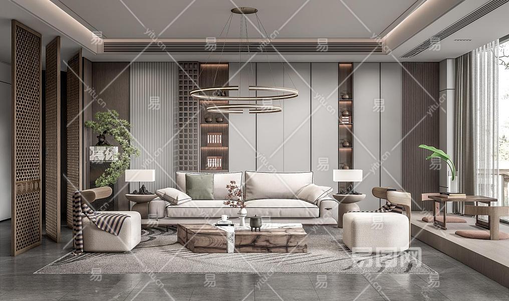 新中式客厅 沙发茶几组合 吊灯 茶桌椅 屏风隔断 双人沙发 绿植盆栽