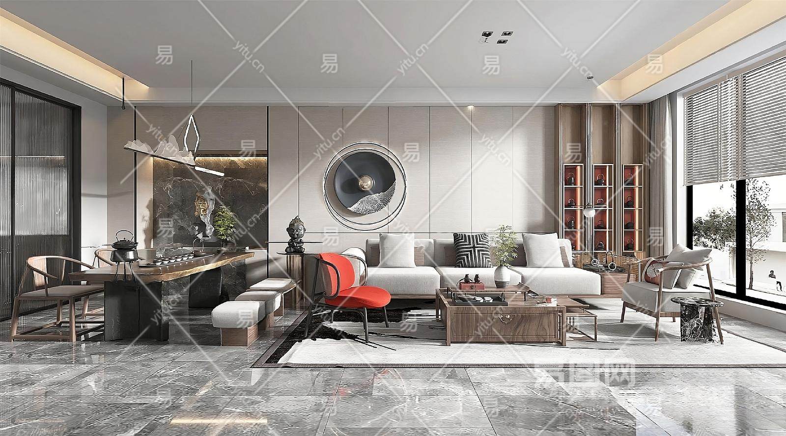 新中式家居客厅 沙发组合 茶几桌椅组合 地毯 吊灯 装饰画 绿植