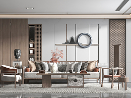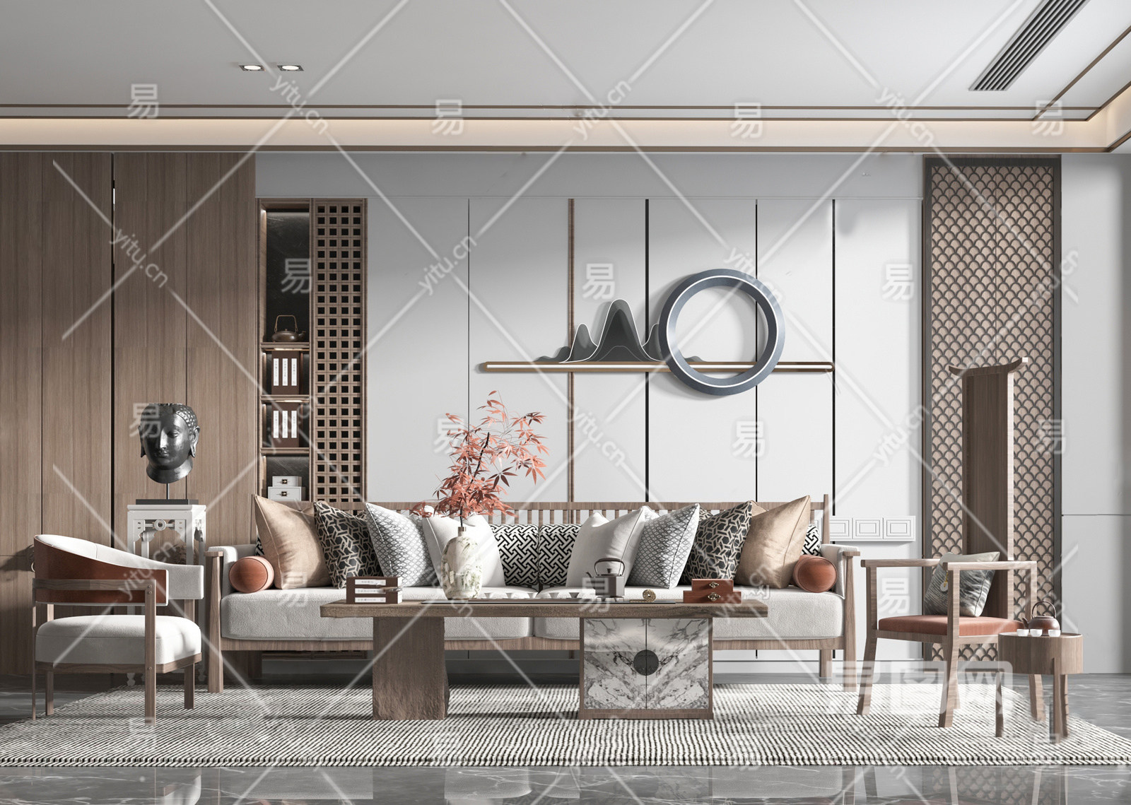 新中式家居客厅 沙发茶几组合 边几 单椅 墙饰 佛头 摆件