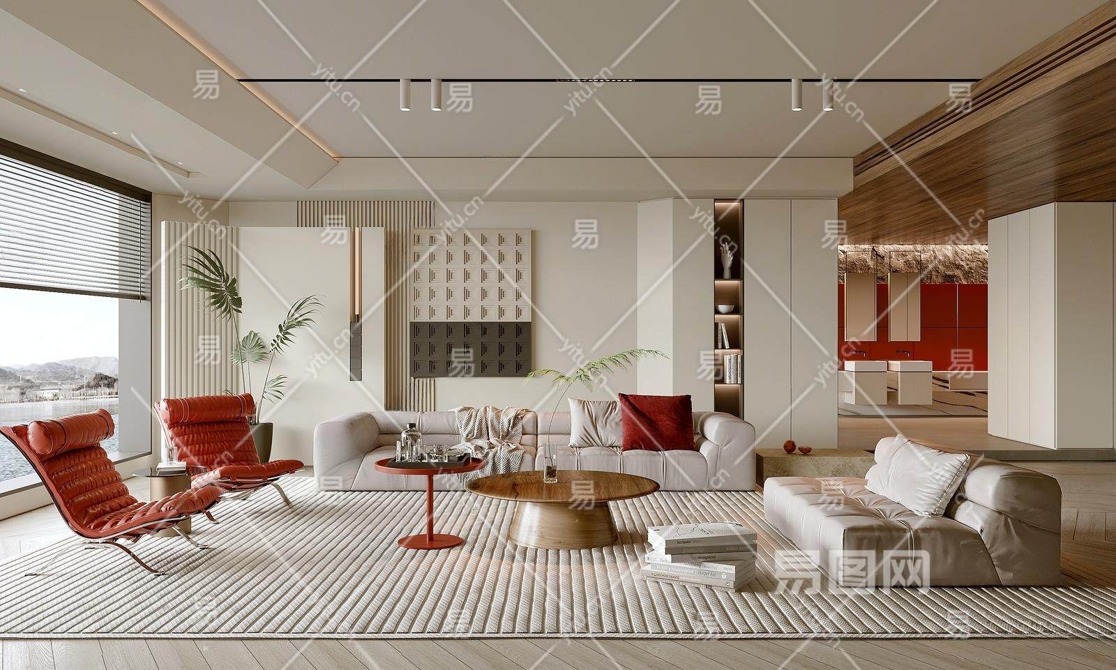 现代奶油风客厅 沙发 边几 茶几 盆栽 书籍 洗手池 洗手池 装饰柜