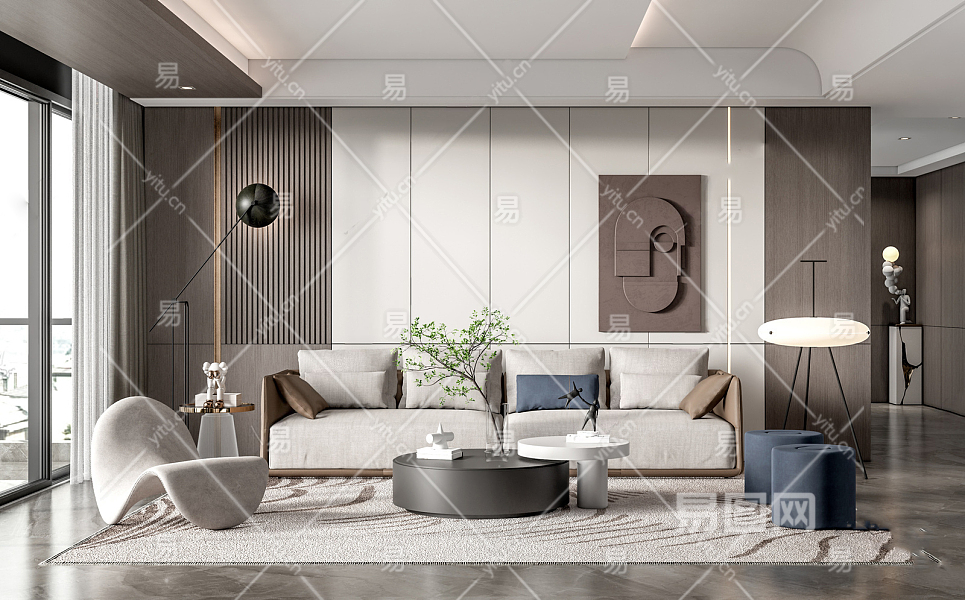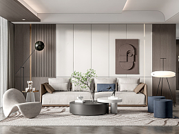 现代客厅 沙发茶几组合 休闲椅 落地灯 雕塑摆件 墙饰 地毯