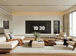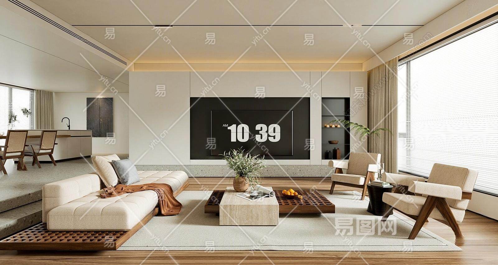 侘寂客餐厅 沙发组合 茶几 绿植 水果 电视背景墙 吧台