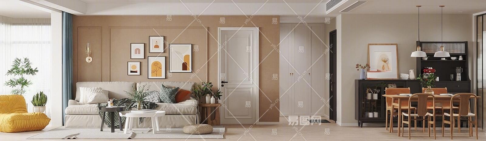 北欧宜家风客餐厅 沙发茶几组合 餐桌椅 餐边柜 钢琴 沙发 电视背景墙