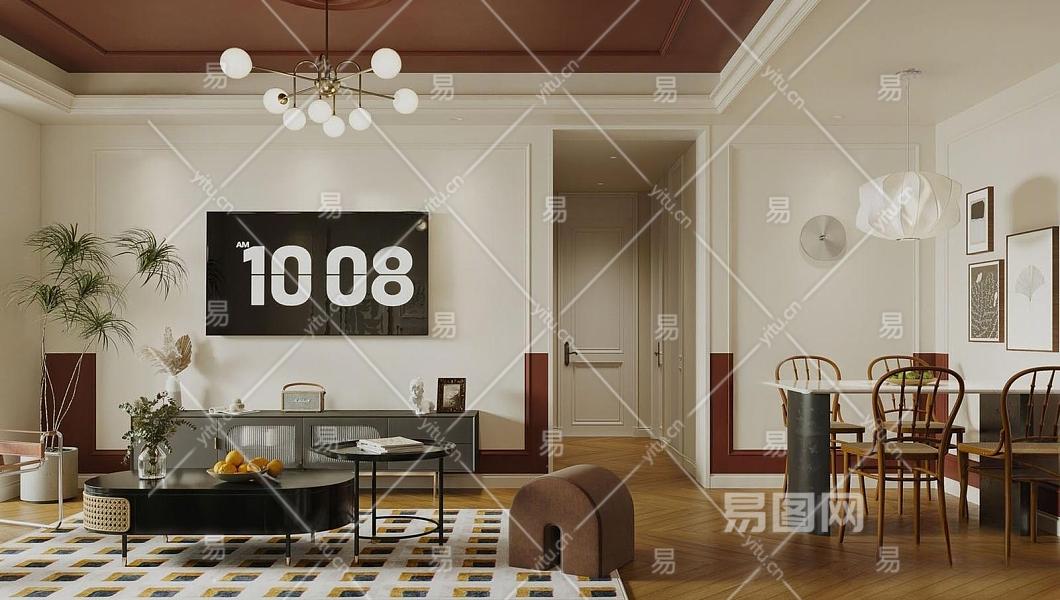 法式复古客餐厅 餐桌椅组合 电视机 植物