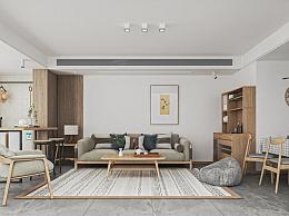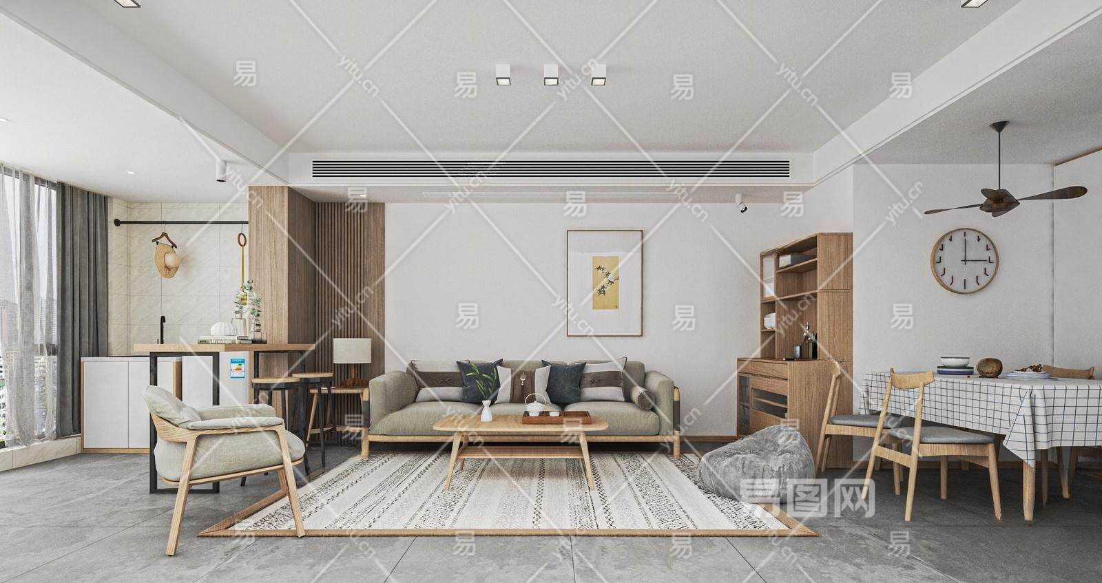 日式家居客餐厅 沙发组合 餐桌椅 酒柜 吊灯 背景墙 餐边柜 窗帘 餐椅