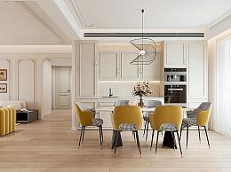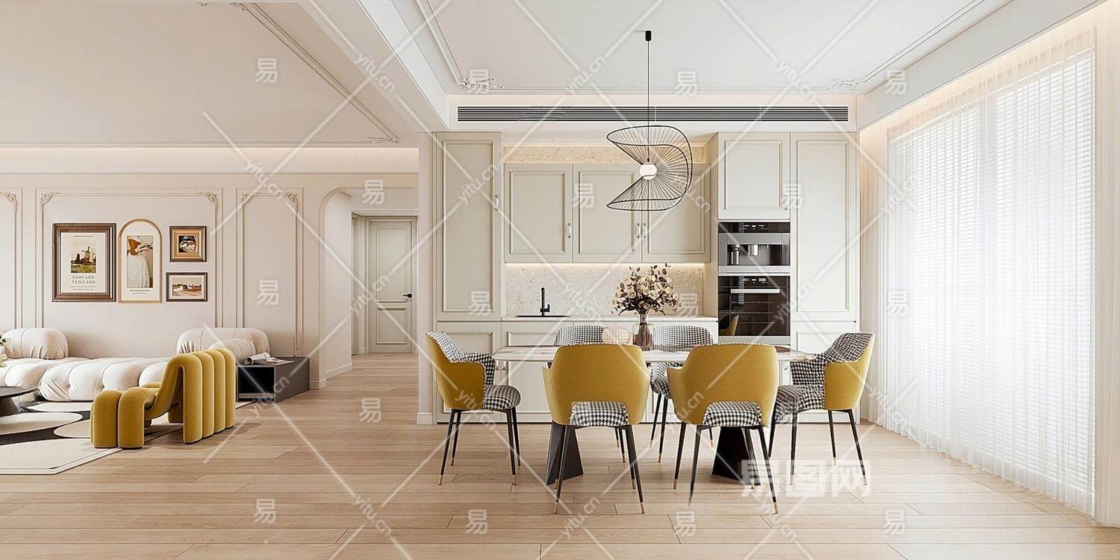 法式奶油客餐厅 单人沙发 餐桌椅组合 开放式橱柜 客厅沙发背景墙