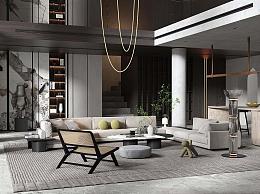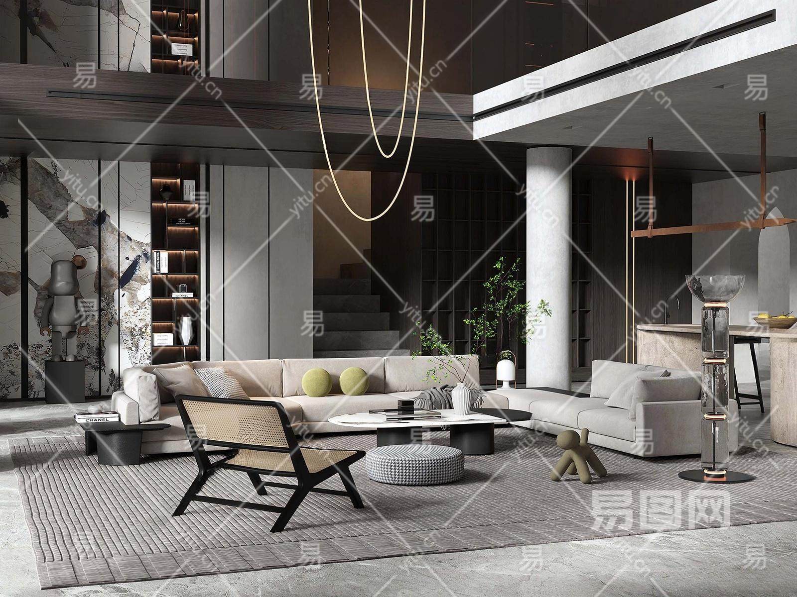 现代别墅客餐厅 沙发座椅茶几组合 单椅 休闲椅 吊灯
