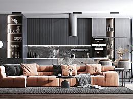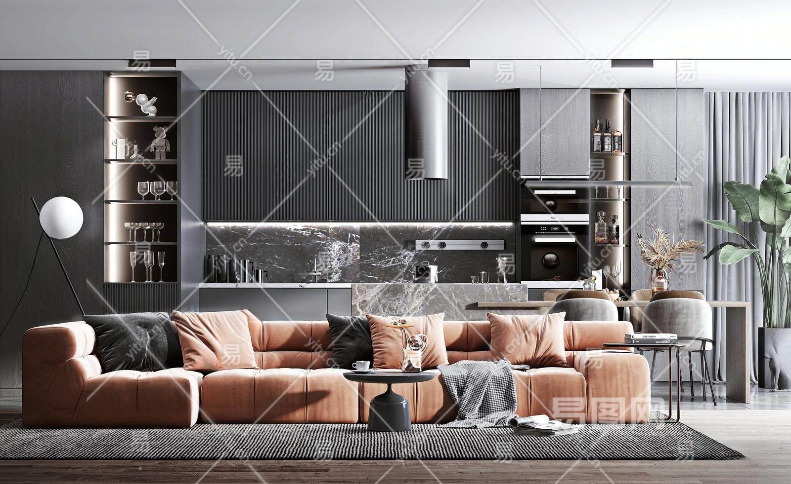 现代客餐厅 开放式厨房 橱柜 餐吧台 厨具 多人沙发 边几