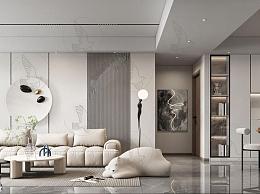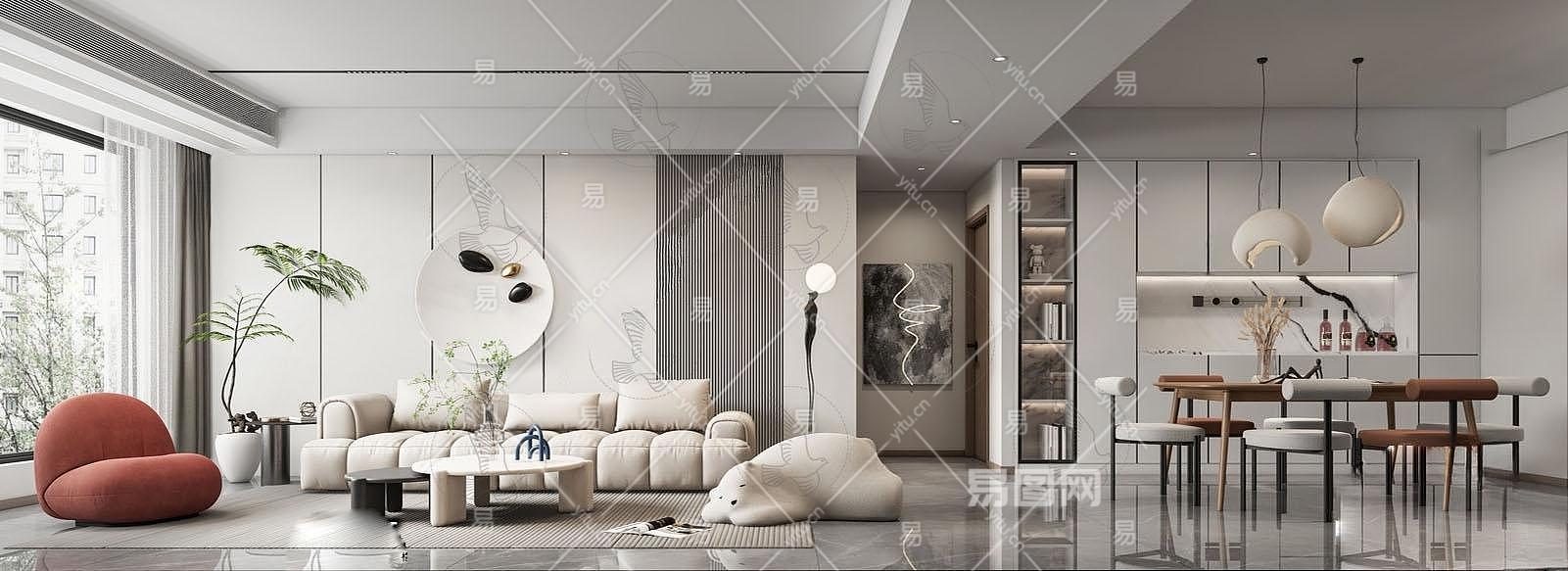 现代客餐厅 沙发茶几组合 吊灯 餐桌椅 西橱柜 雕塑摆件