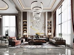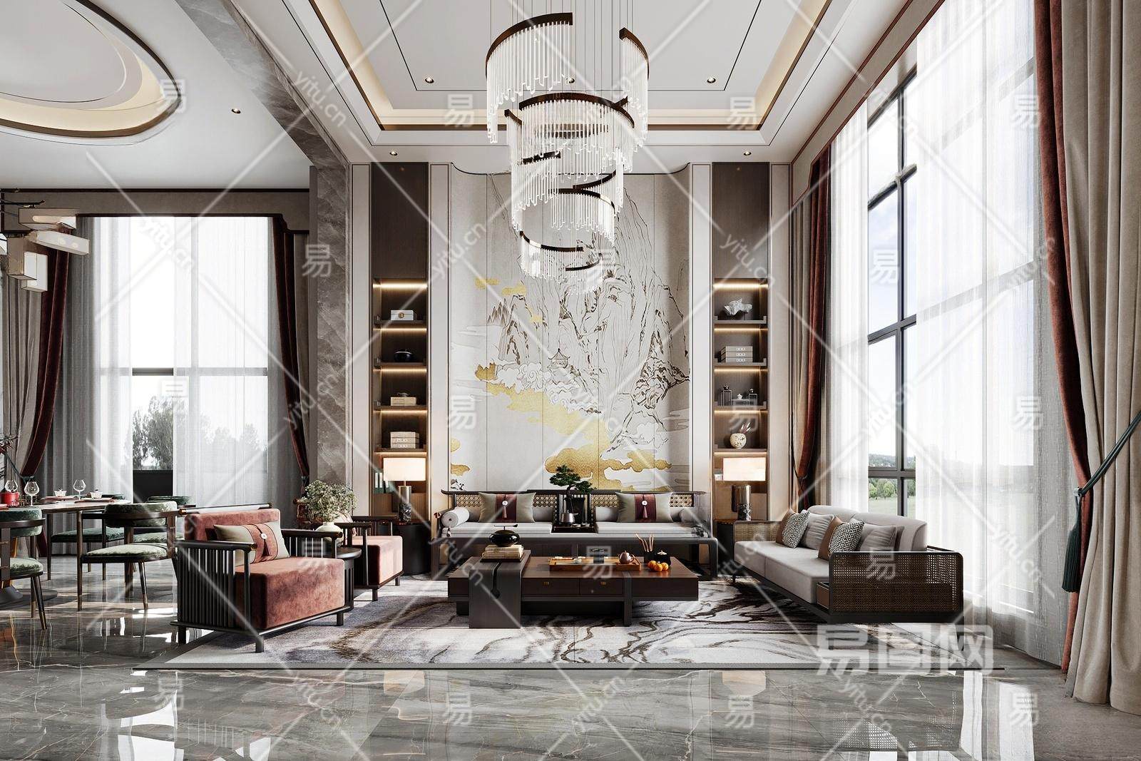 新中式别墅客餐厅 沙发茶几组合 大型吊灯 背景墙 餐桌椅 茶几