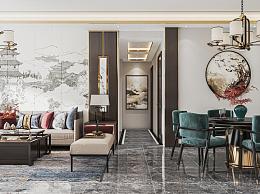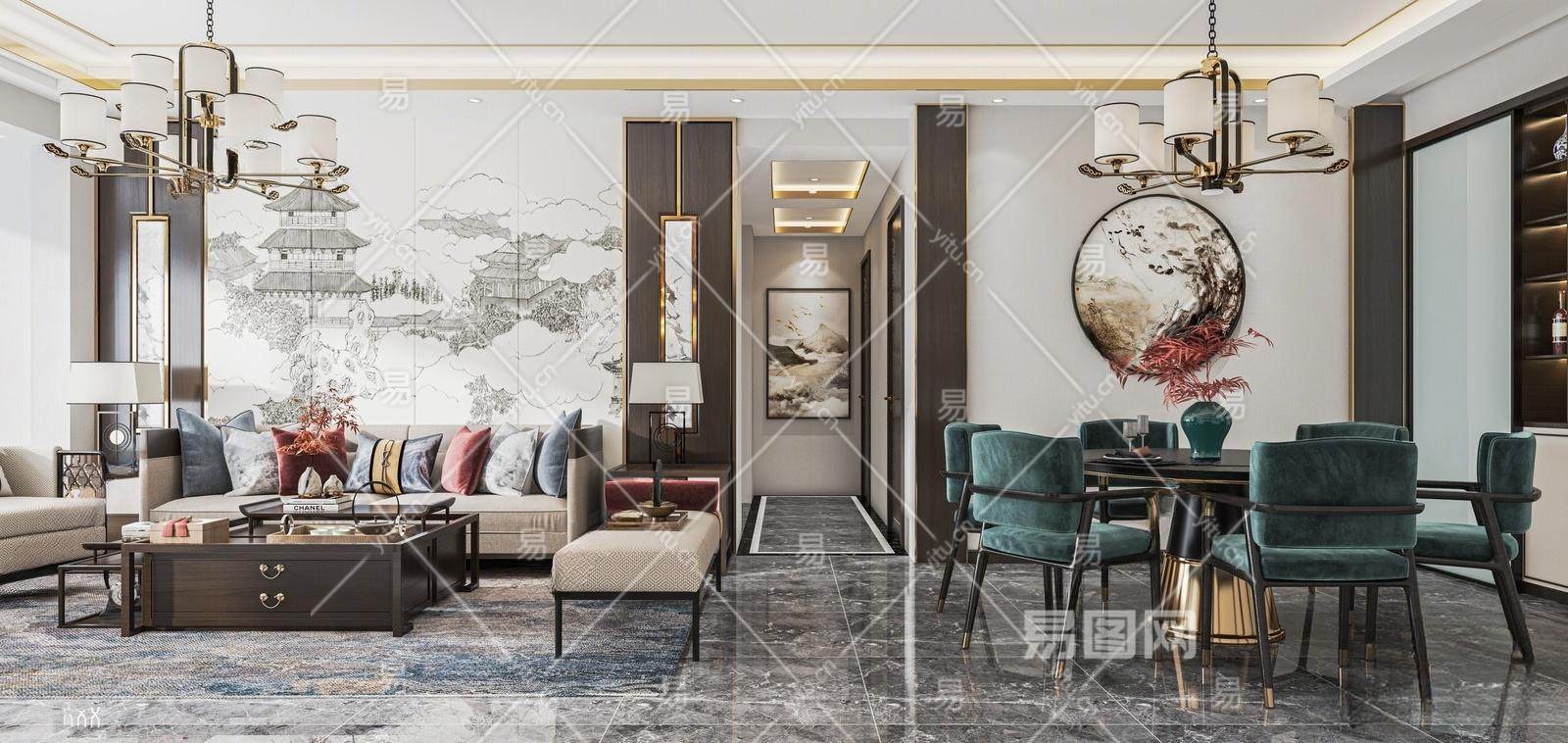 新中式客餐厅 客厅沙发茶几 电视背景墙 餐厅 单椅 餐桌椅 吊灯