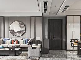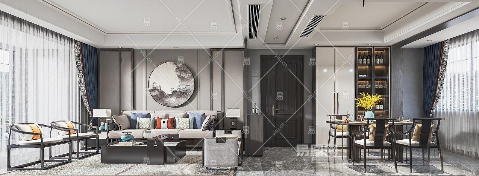新中式客餐厅 客厅沙发茶几 电视背景墙 餐厅 单椅 餐桌椅