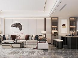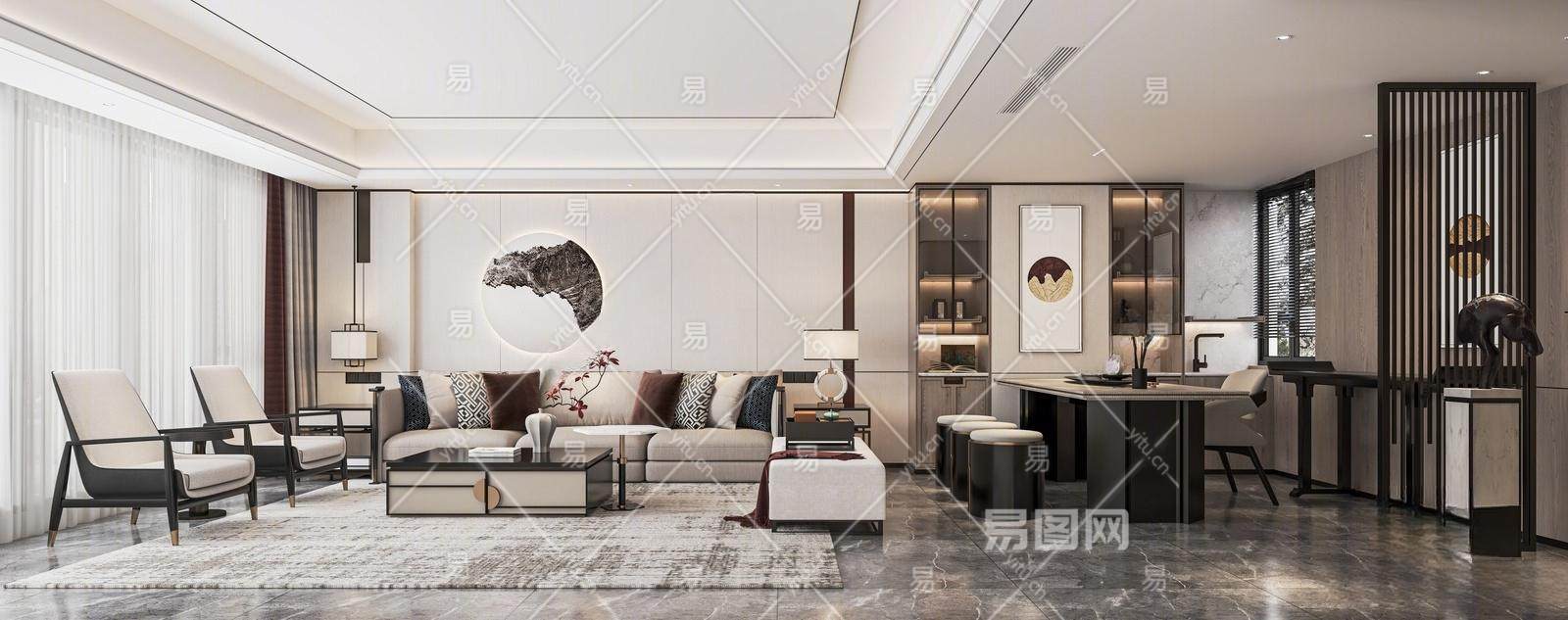 新中式客餐厅 沙发茶几组合 沙发背景墙 餐厅 西餐台 单椅 餐桌椅 吊灯