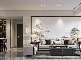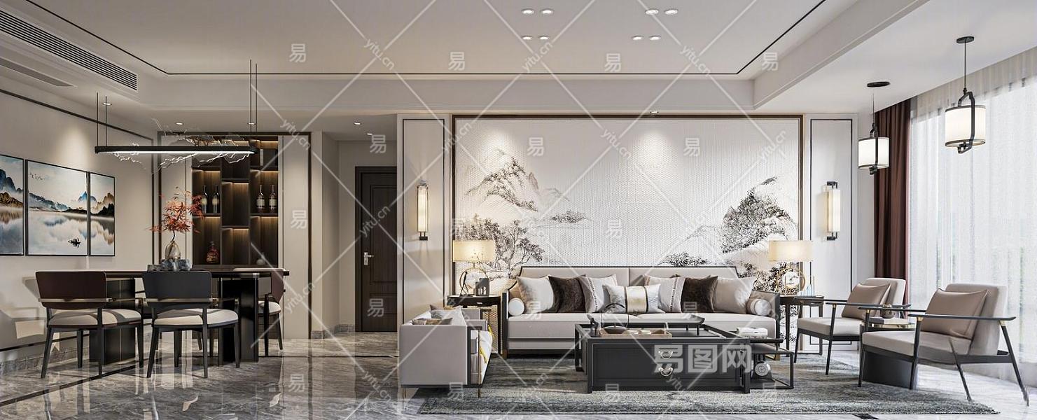 新中式家居客餐厅 沙发茶几 沙发背景墙 装饰柜