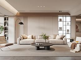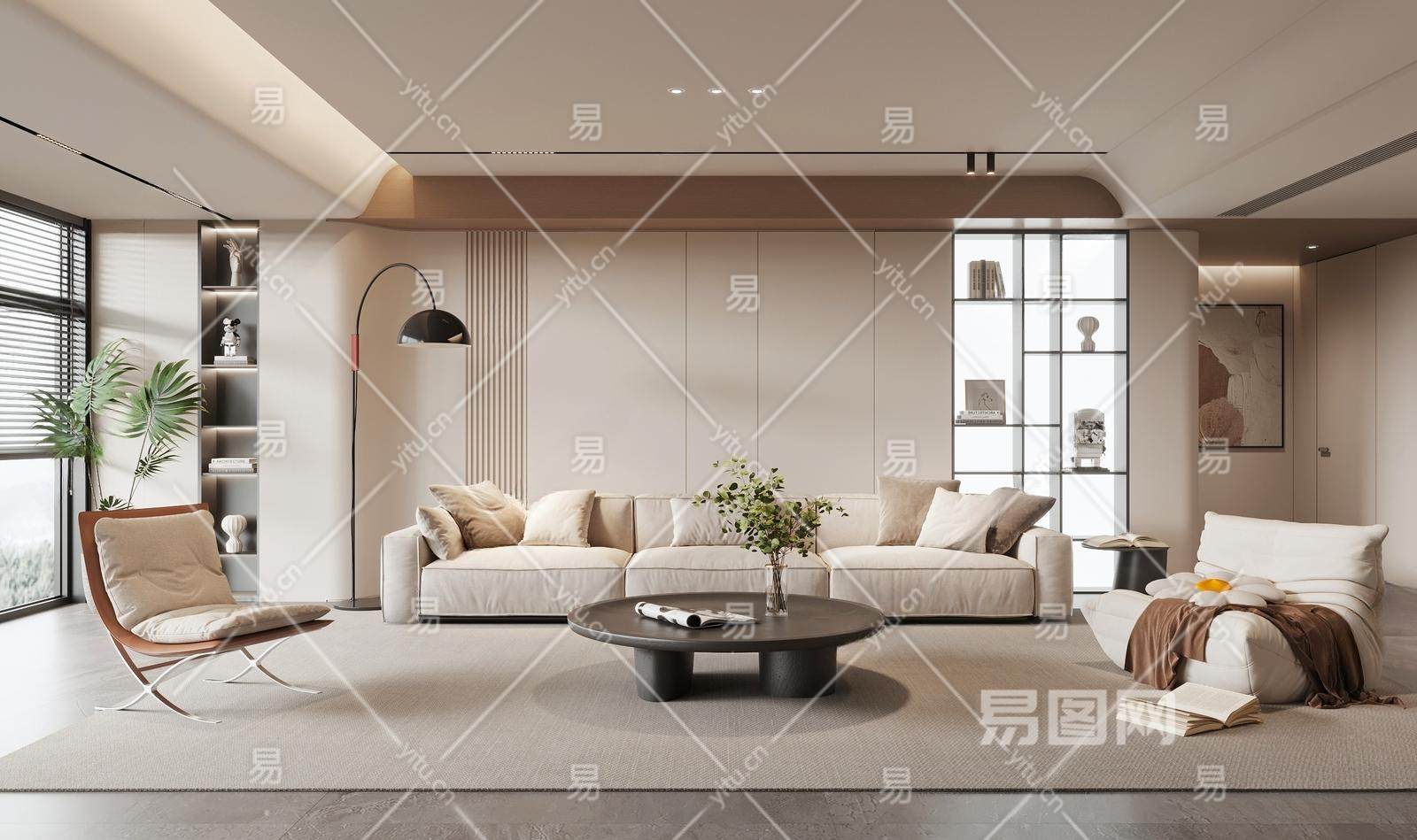 现代奶油风简约家居客厅 沙发茶几组合 休闲椅 背景墙 轻奢 客餐厅