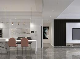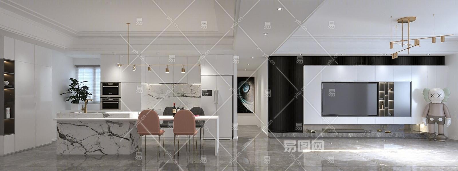 现代客餐厅 沙发茶几组合 休闲椅 餐桌椅组合 吊灯 绿植