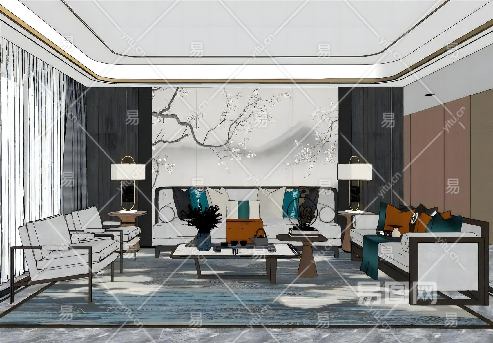 新中式客餐厅沙发茶几组合