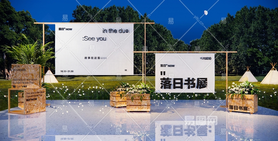 现代网红露营美陈 网红打卡书店主题外摆美陈 落日灯牌 花箱书箱 氛围绿植