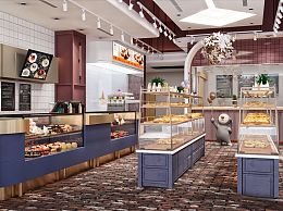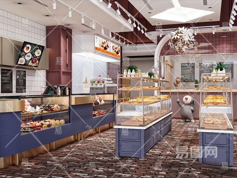 现代甜品面包店 蛋糕店 广告灯箱 面包柜 蛋糕架 前台 雕塑 吊灯
