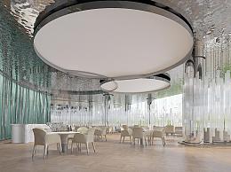 现代售楼部 前台 接待区 服务台 洽谈区 沙发 洽谈桌椅 金属波浪板