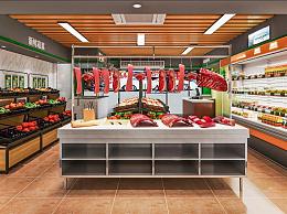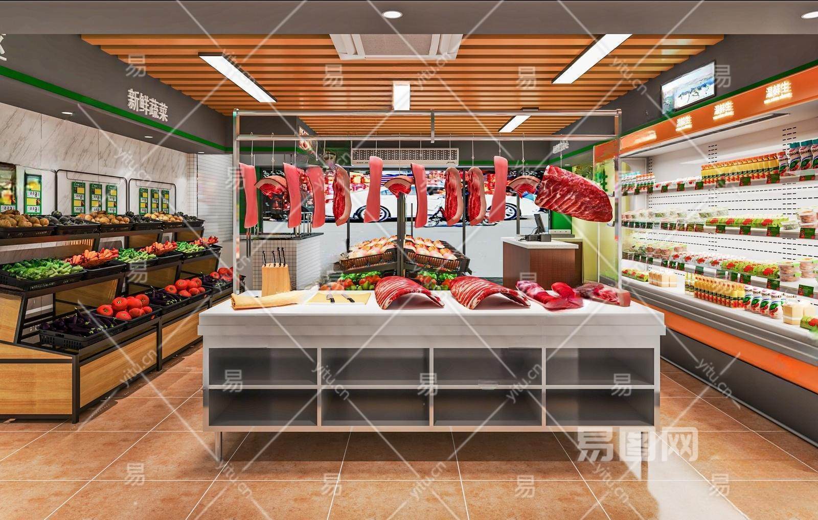 现代超市 生鲜超市 超市生鲜区 水果蔬菜 粮油 商品货架 冰柜