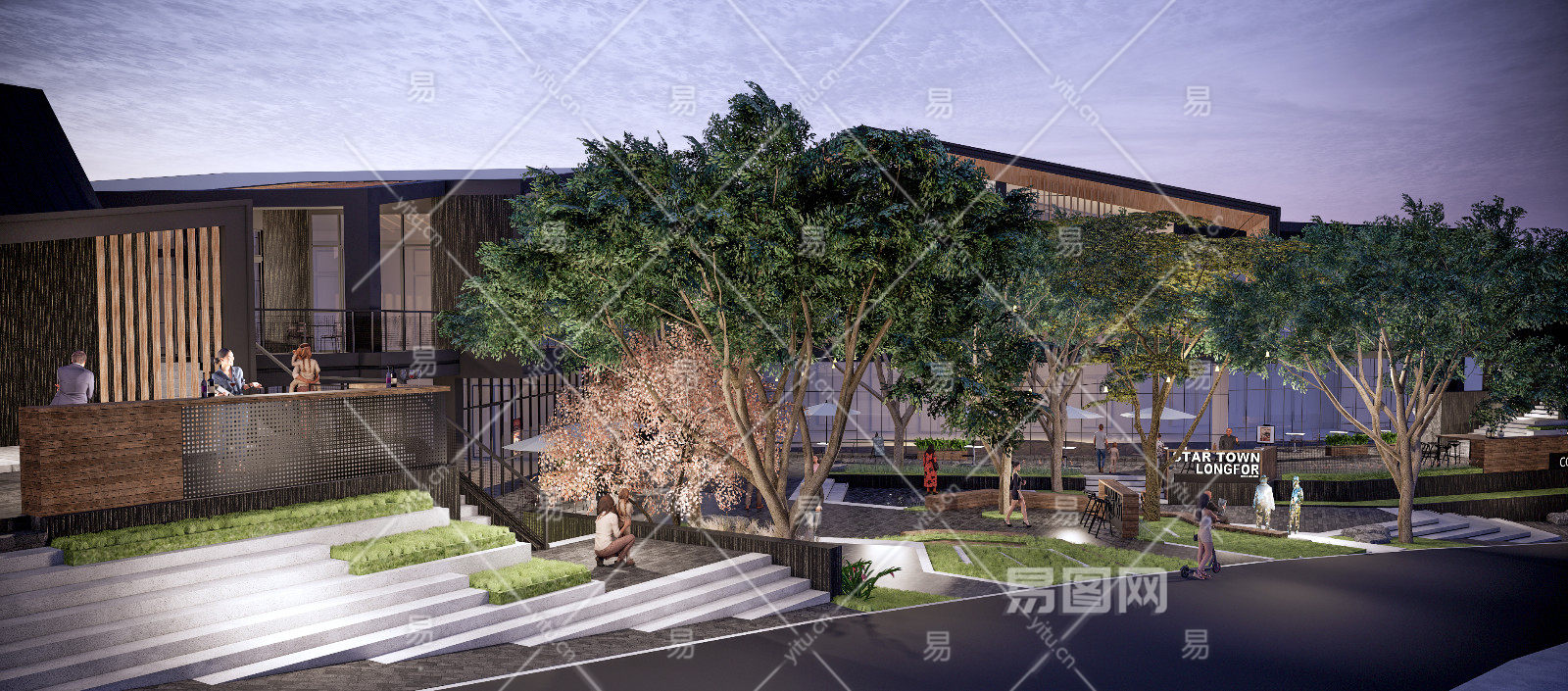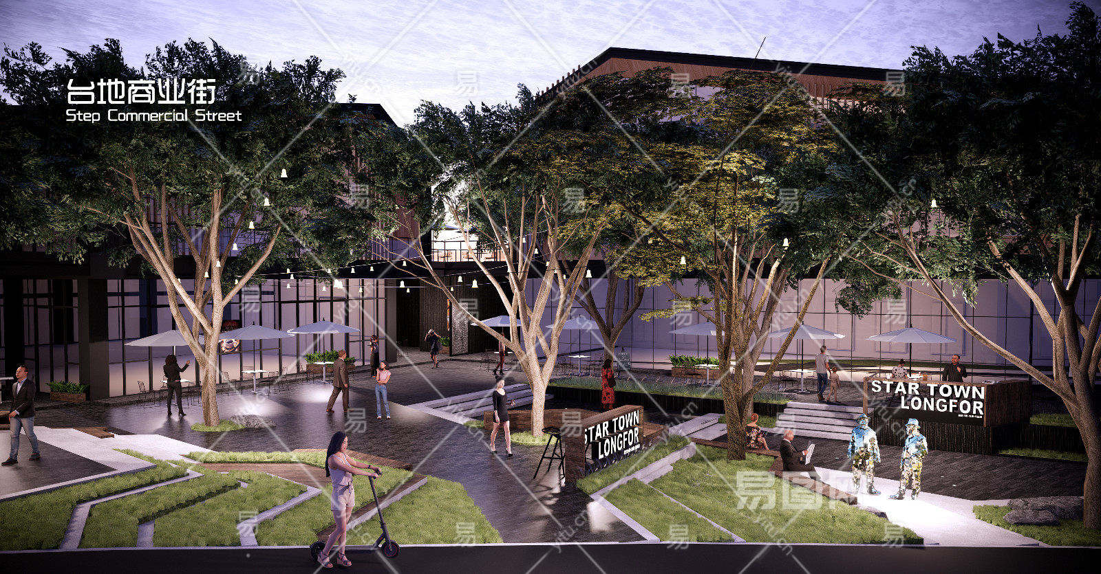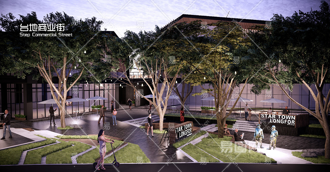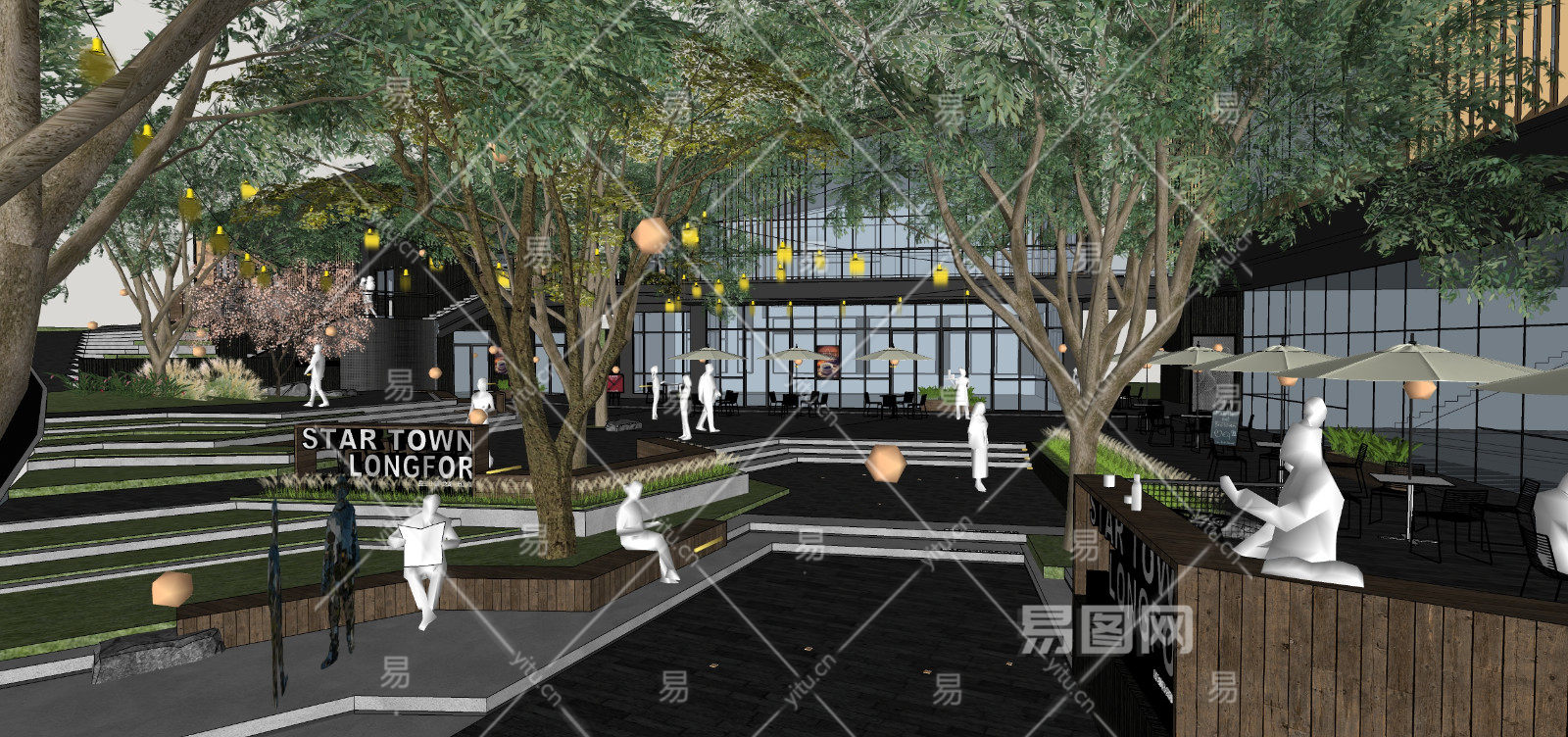 现代商业街 台阶台地景观 氛围灯挂树灯 吧台外摆座椅遮阳伞 人物互动装置