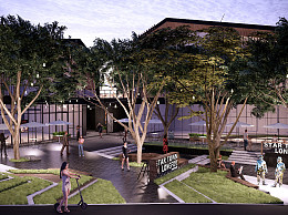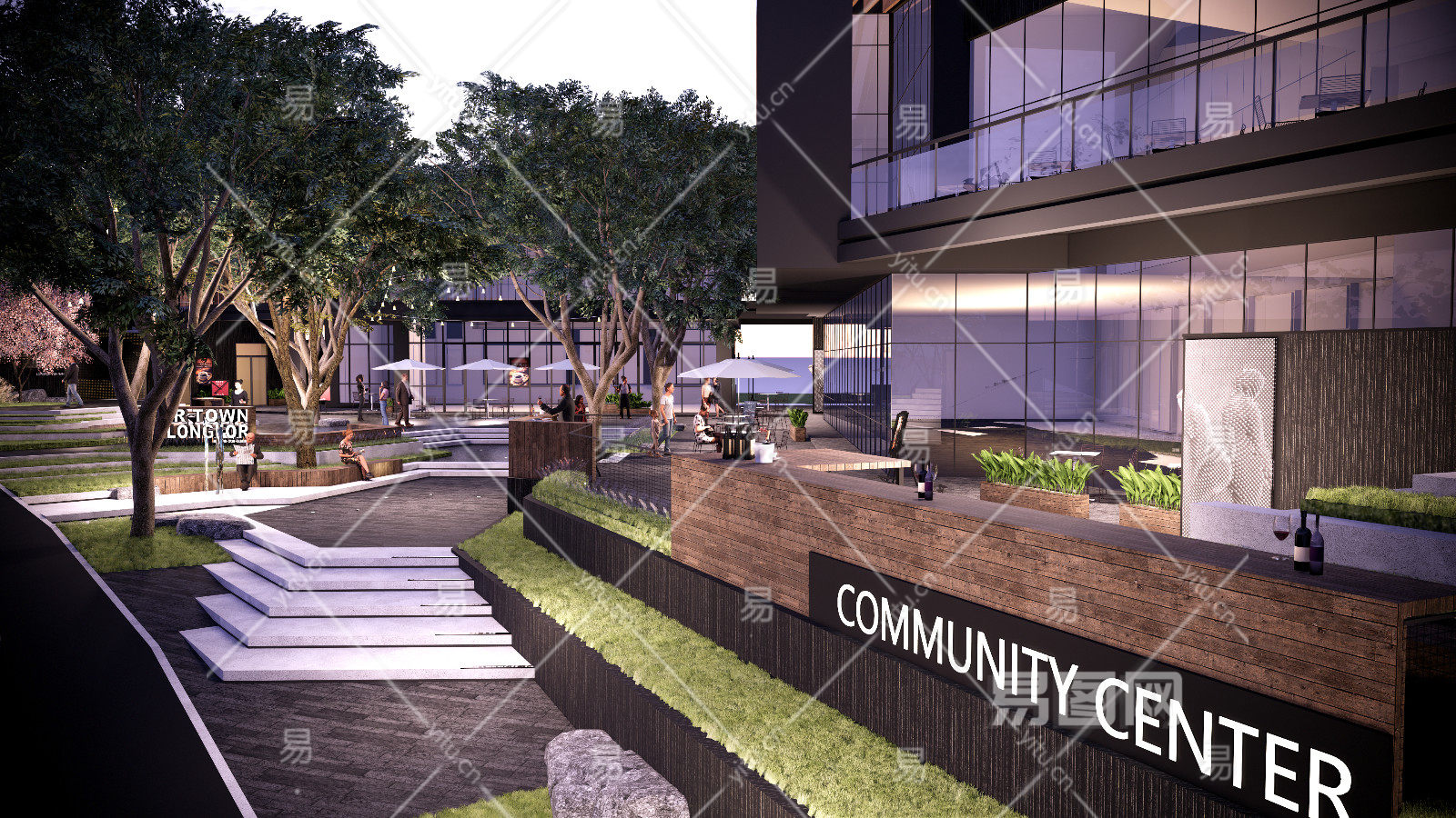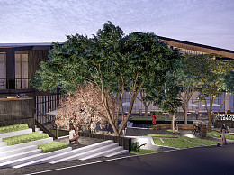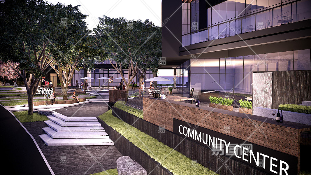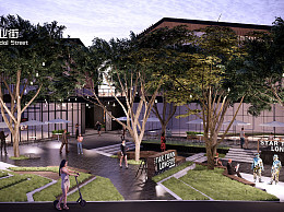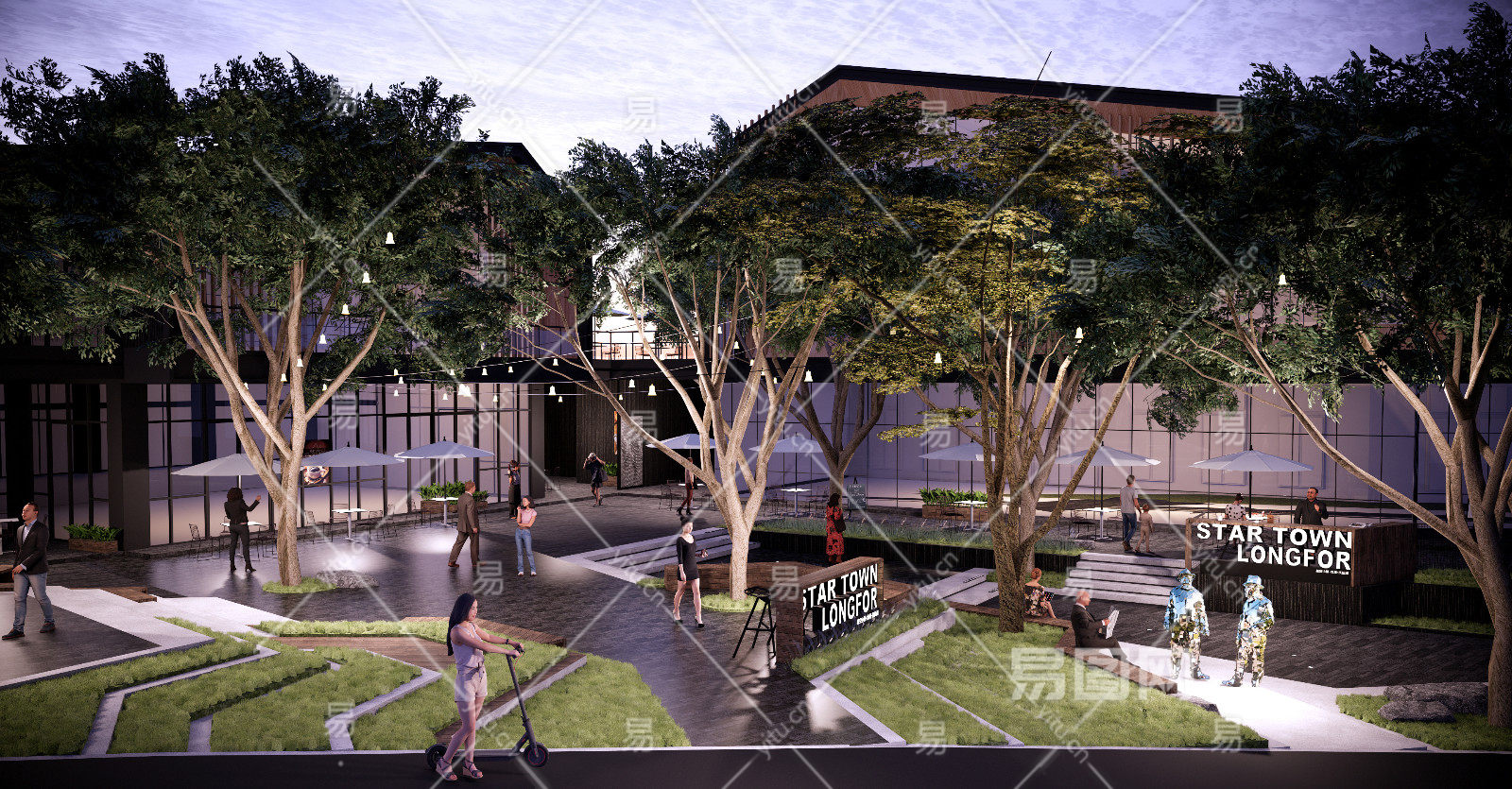 现代商业街 台阶台地景观 氛围灯挂树灯 吧台外摆座椅遮阳伞 人物互动装置