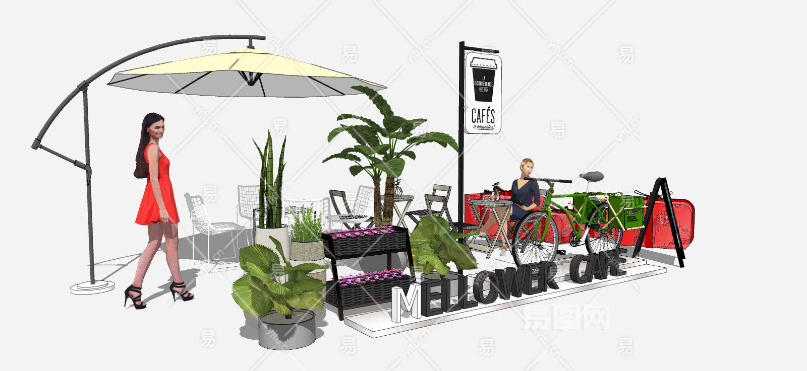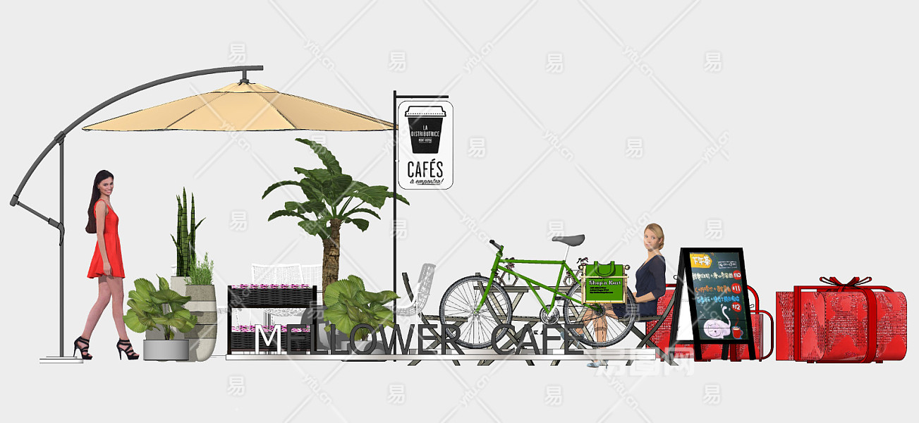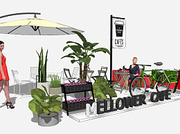现代风格商业街景观 户外座椅 外摆 遮阳伞 花箱 盆栽 小品