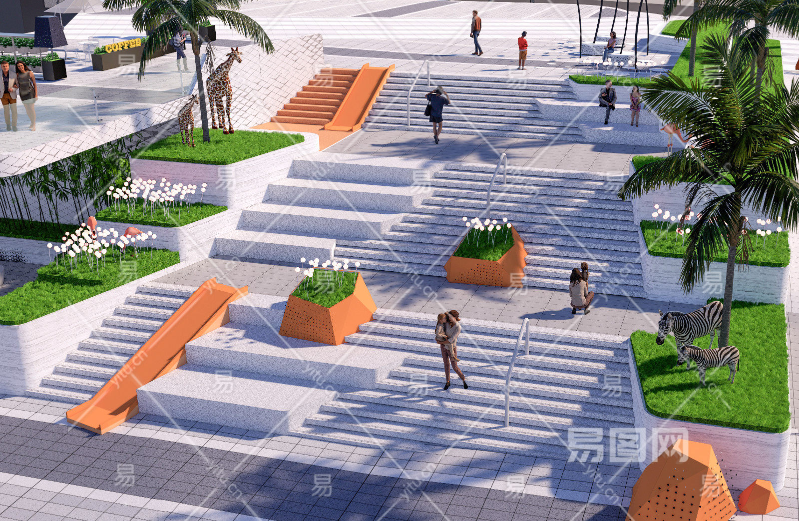 现代商业台阶景观 商业街高差梯步 异形穿孔板树池 趣味滑梯 趣味动物星星灯
