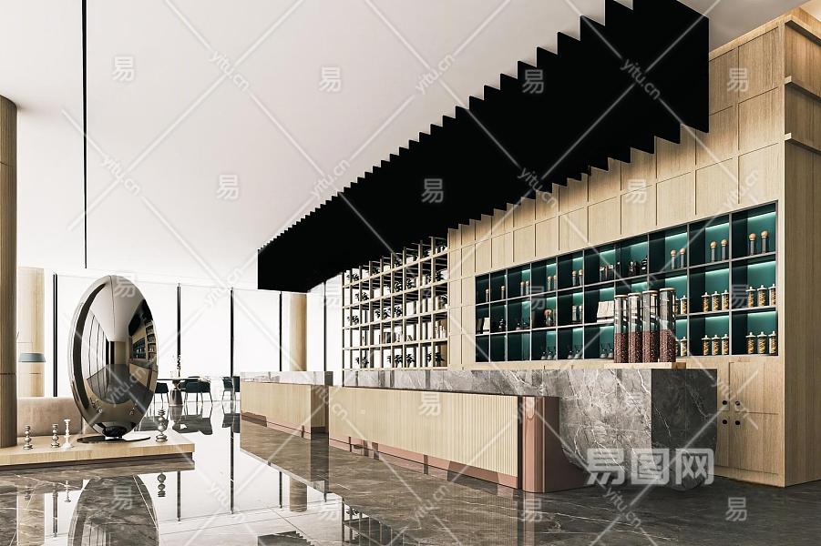 现代售楼处水吧台 洽谈区 洽谈桌椅 吊灯 接待区 大厅大堂