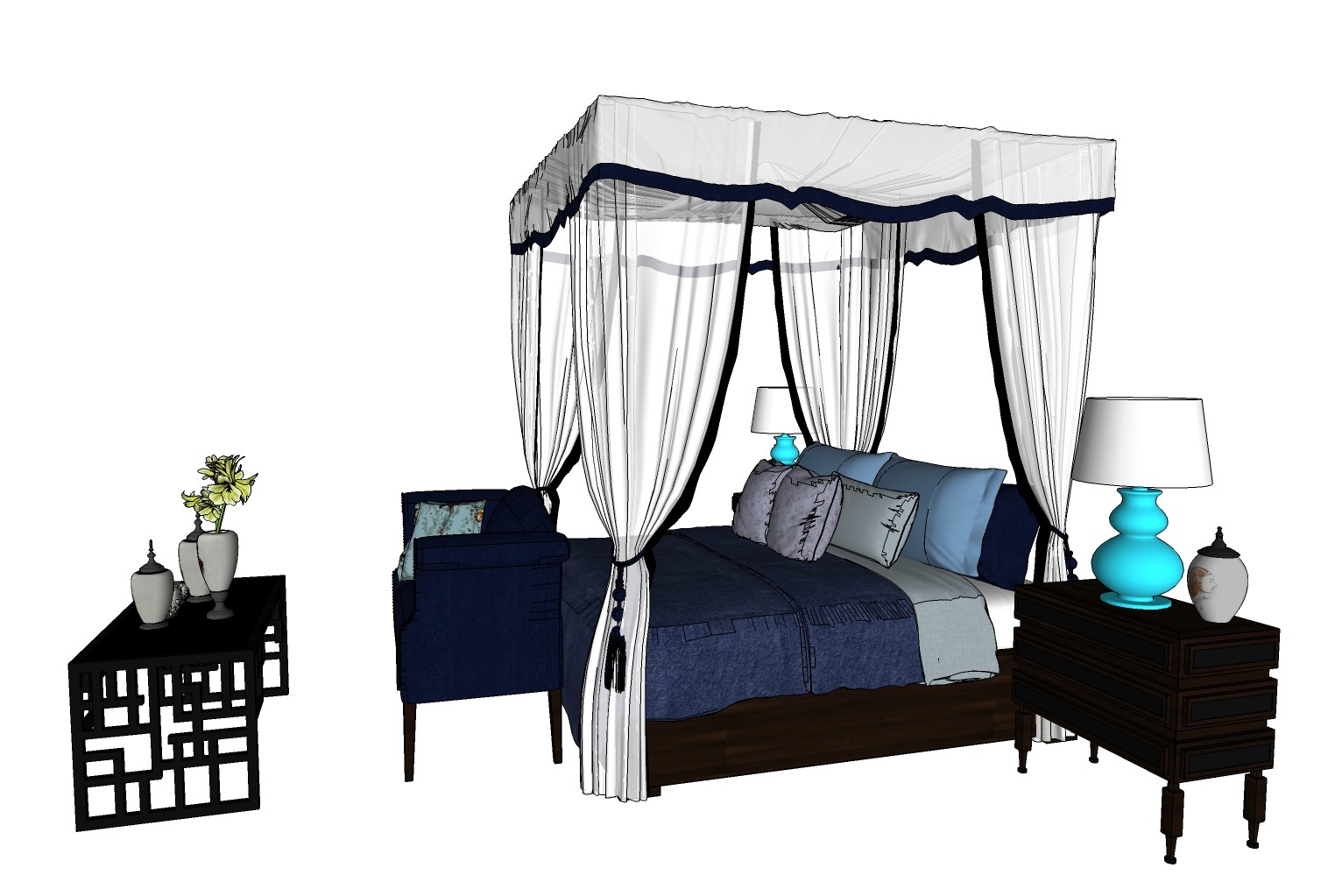 中式双人床组合su模型,中式双人床skp模型下载