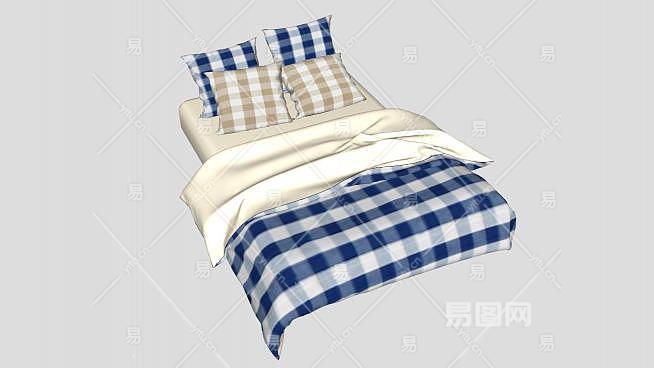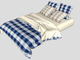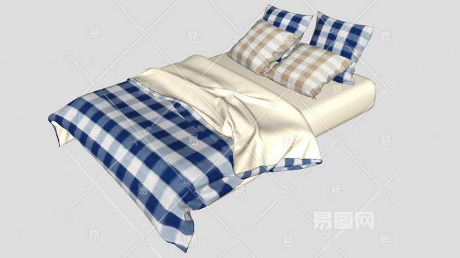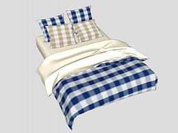 蓝色格纹北欧卧室双人床SU模型下载_sketchup草图大师SKP模型