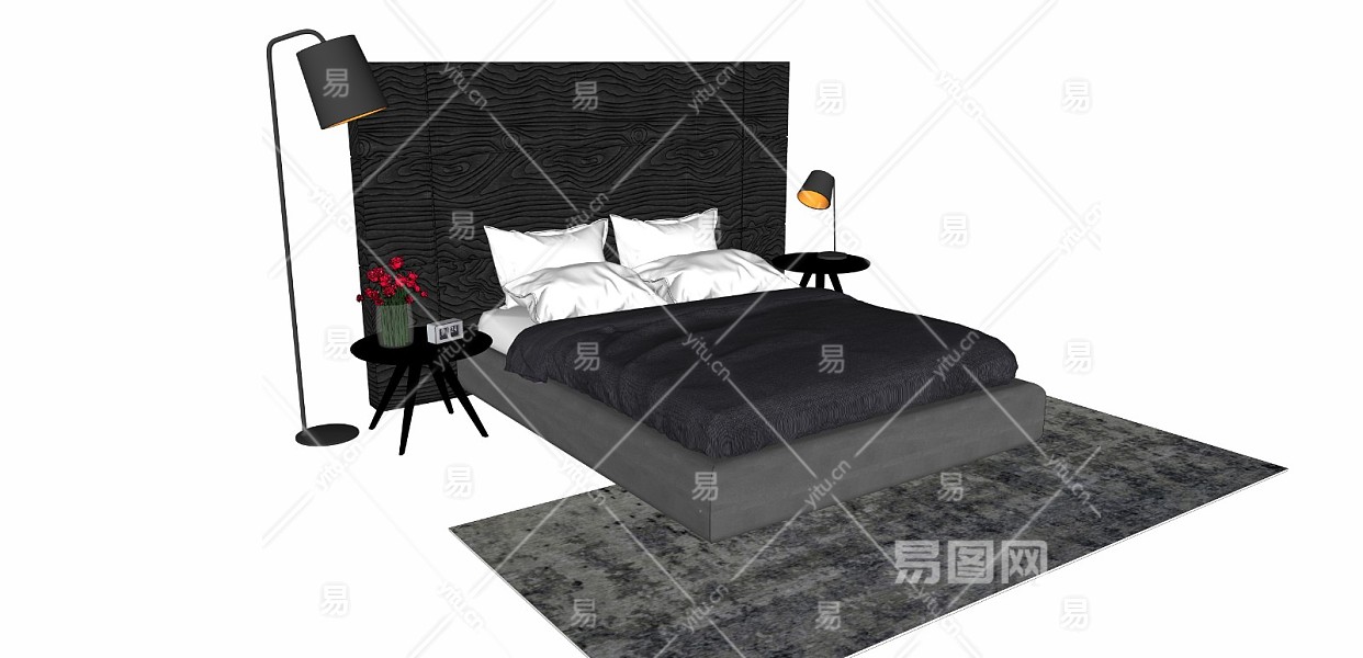 • 北欧风格双人床 轻奢暗黑风卧室组合 床头柜 台灯 地毯 现代简约风 su模型