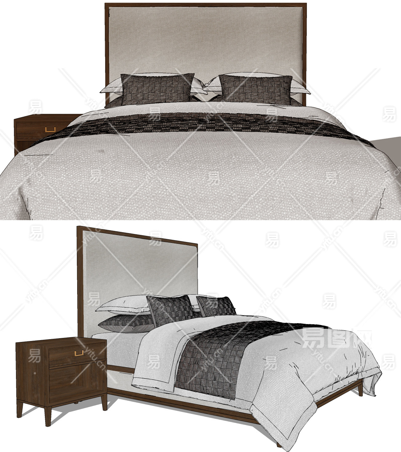 新中式布艺双人床,床头柜,床具su草图模型下载