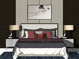 新中式双人床,床品,床头柜,台灯,花瓶摆件,床头装饰挂画su草图模型下载