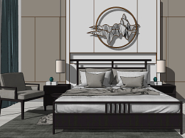 中式新中式卧室双人床,床头柜,单人椅,床头小吊灯,摆件,圆形墙饰,床头背景墙su草图模型下载