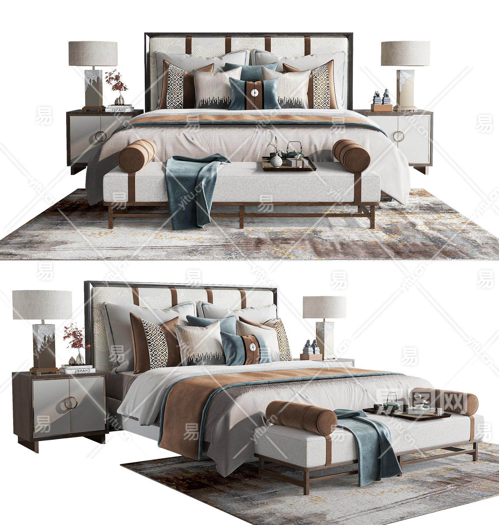 新中式双人床 床头柜 床尾凳 地毯 床品 抱枕 装饰摆件