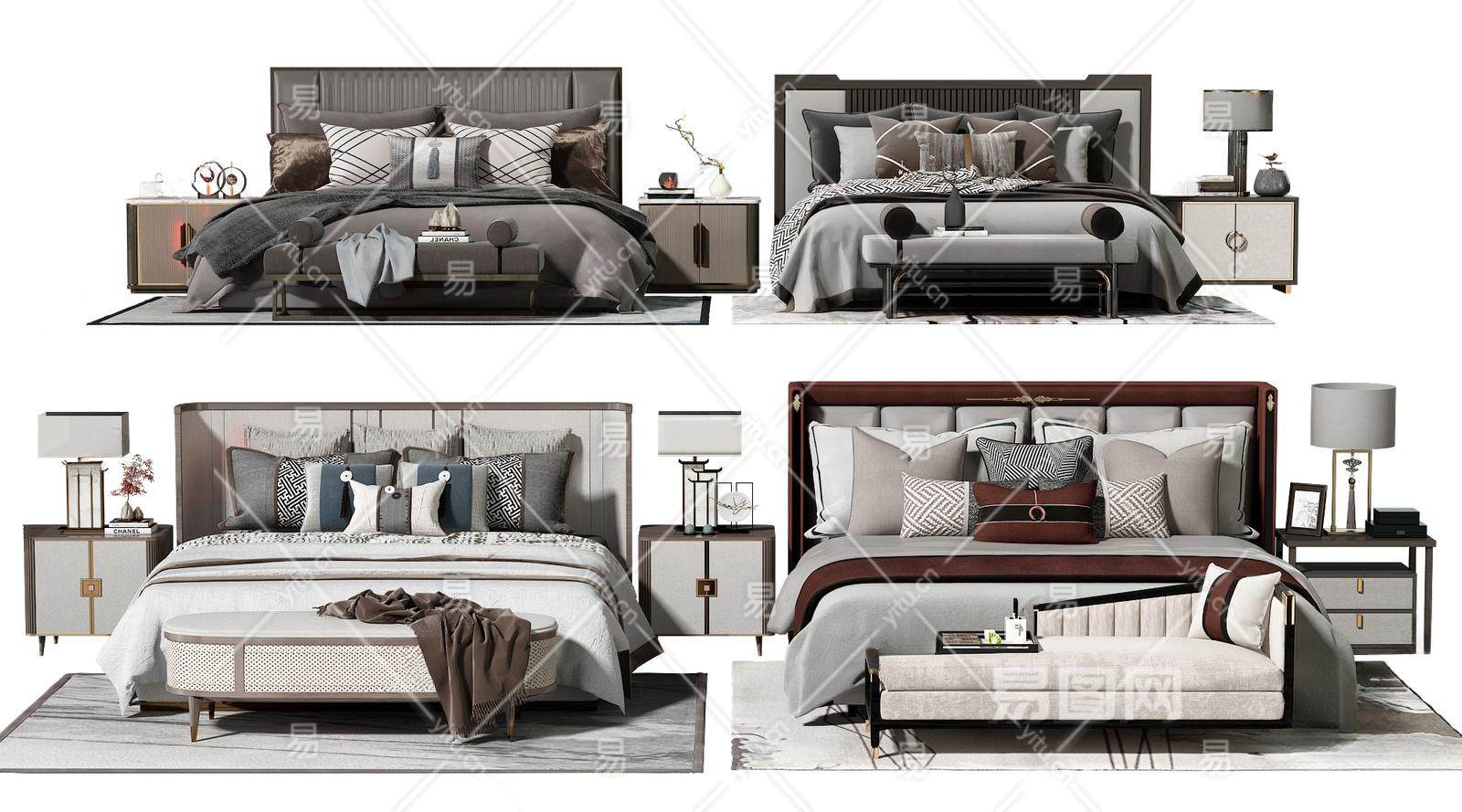 新中式双人床 床头柜 床尾凳 脚踏 床上用品 饰品摆件 花瓶