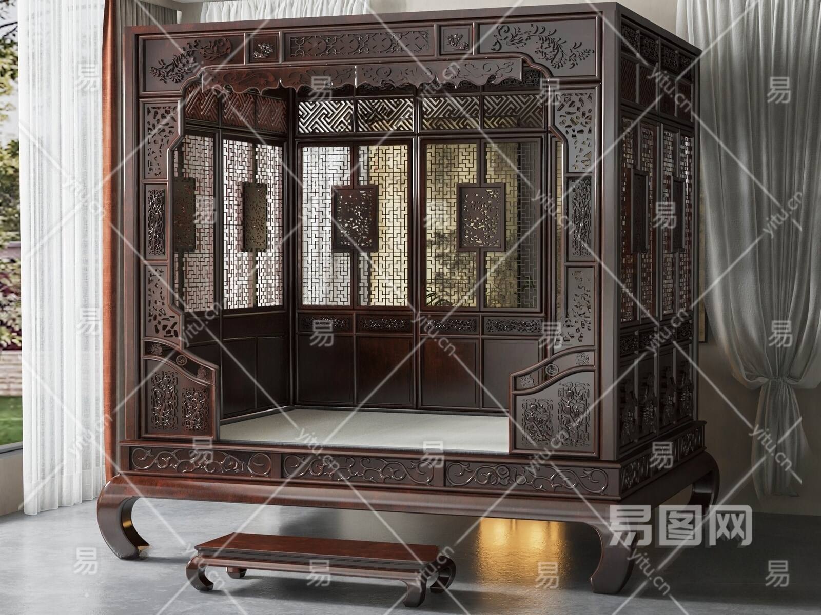 中式高架脚踏板双人床 木材