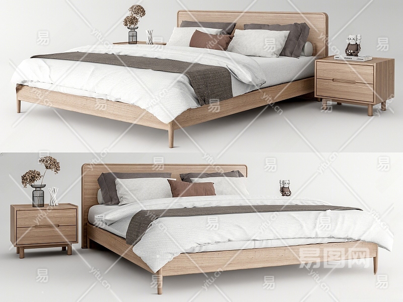 北欧双人床 床头柜 花瓶花艺 雕塑摆件 干花 木材