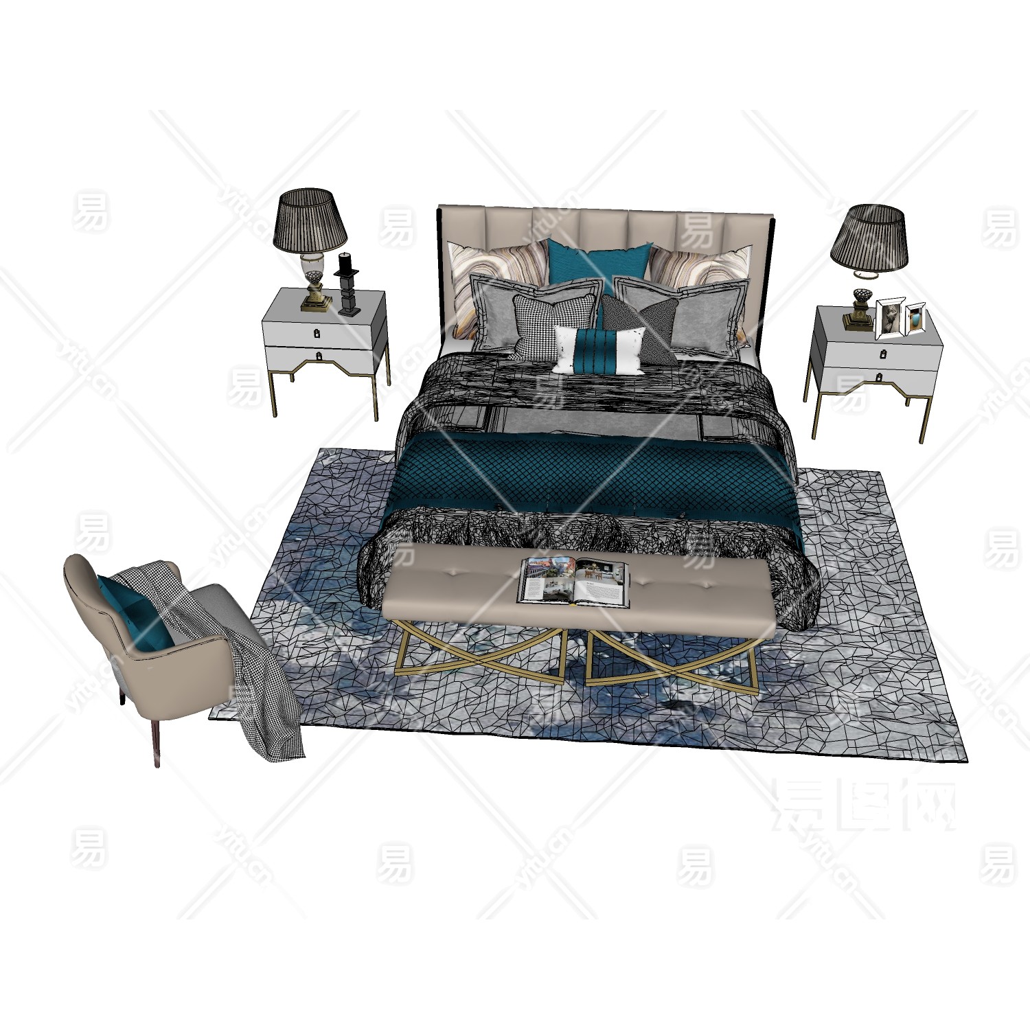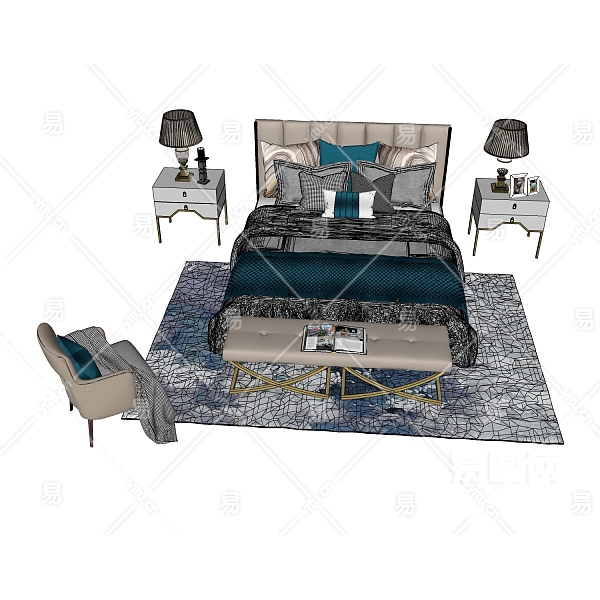 当前的位置:首页 > sketchup > sketchup模型 > 床具 > 双人床 > 简欧卧室双人床组合