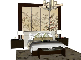 新中式床柜组合草图大师模型,床柜组合SU模型下载