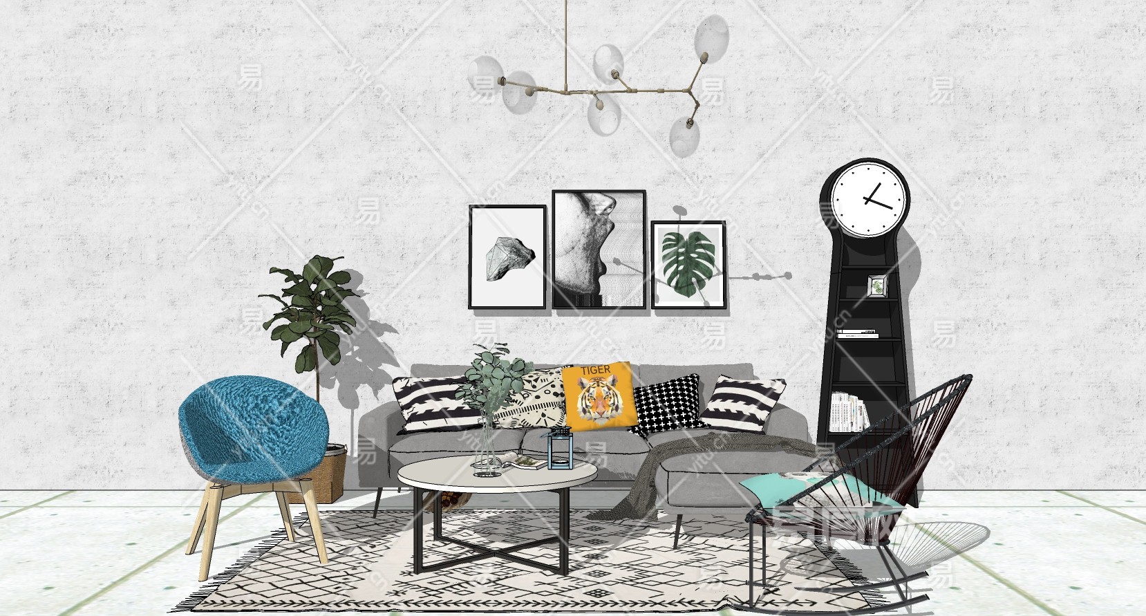 6北欧现代沙发茶几休闲椅子吊灯挂糊石英钟挂钟钟摆植物盆栽su草图模型下载