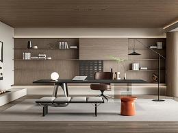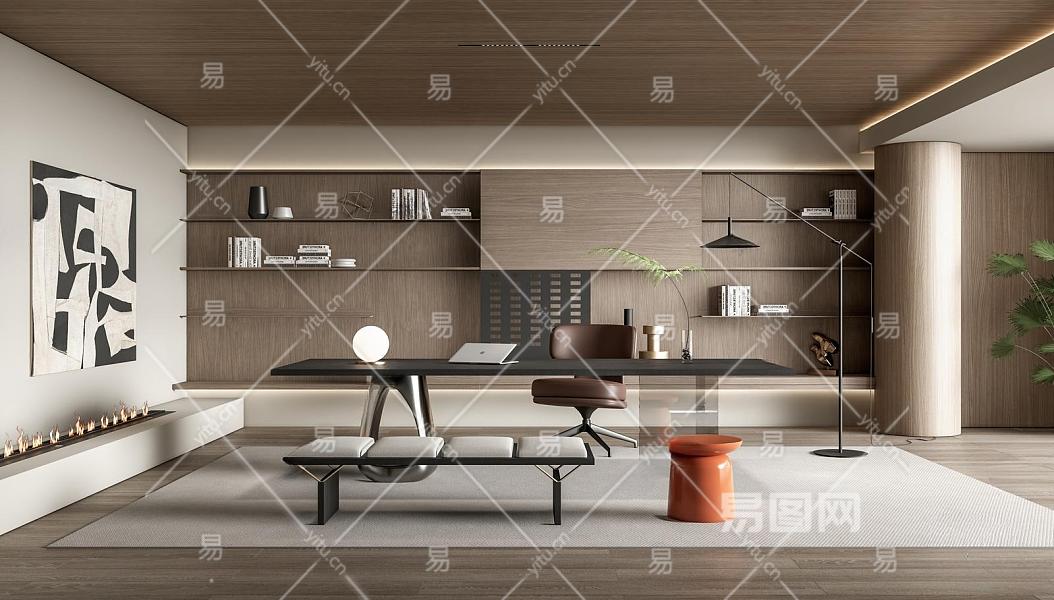现代书房 书桌椅 长凳 书柜 壁炉 落地灯 书本摆件