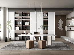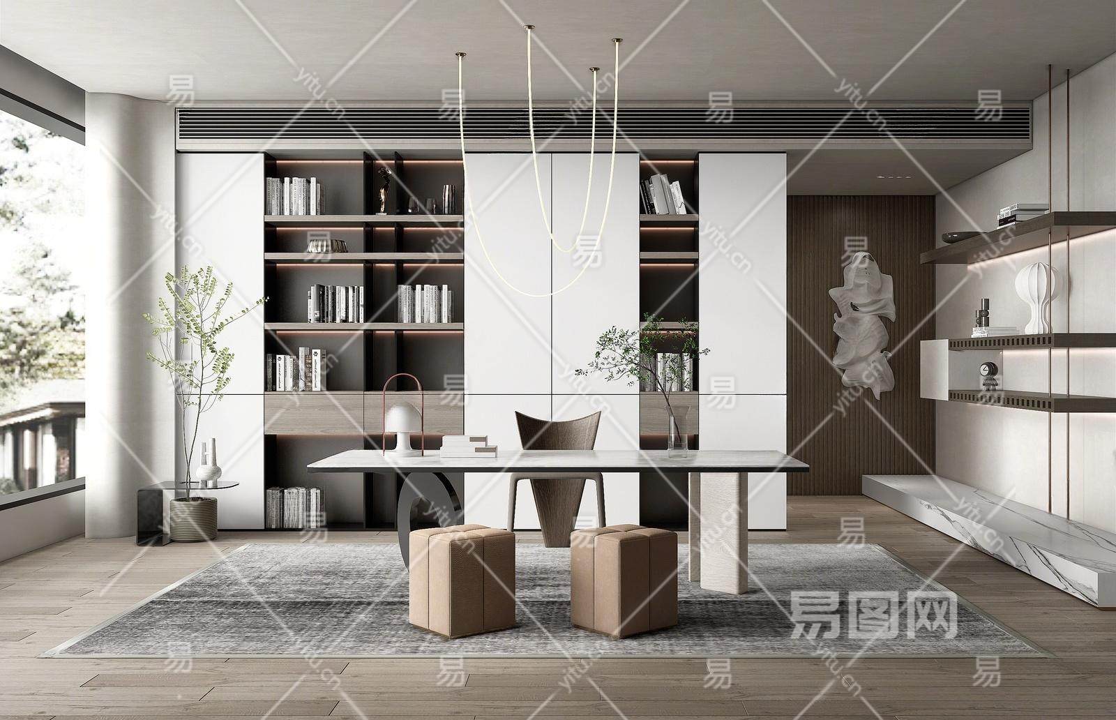 现代书房 书桌椅 书柜书架 吊灯 绿植盆栽 墙饰摆件 凳子